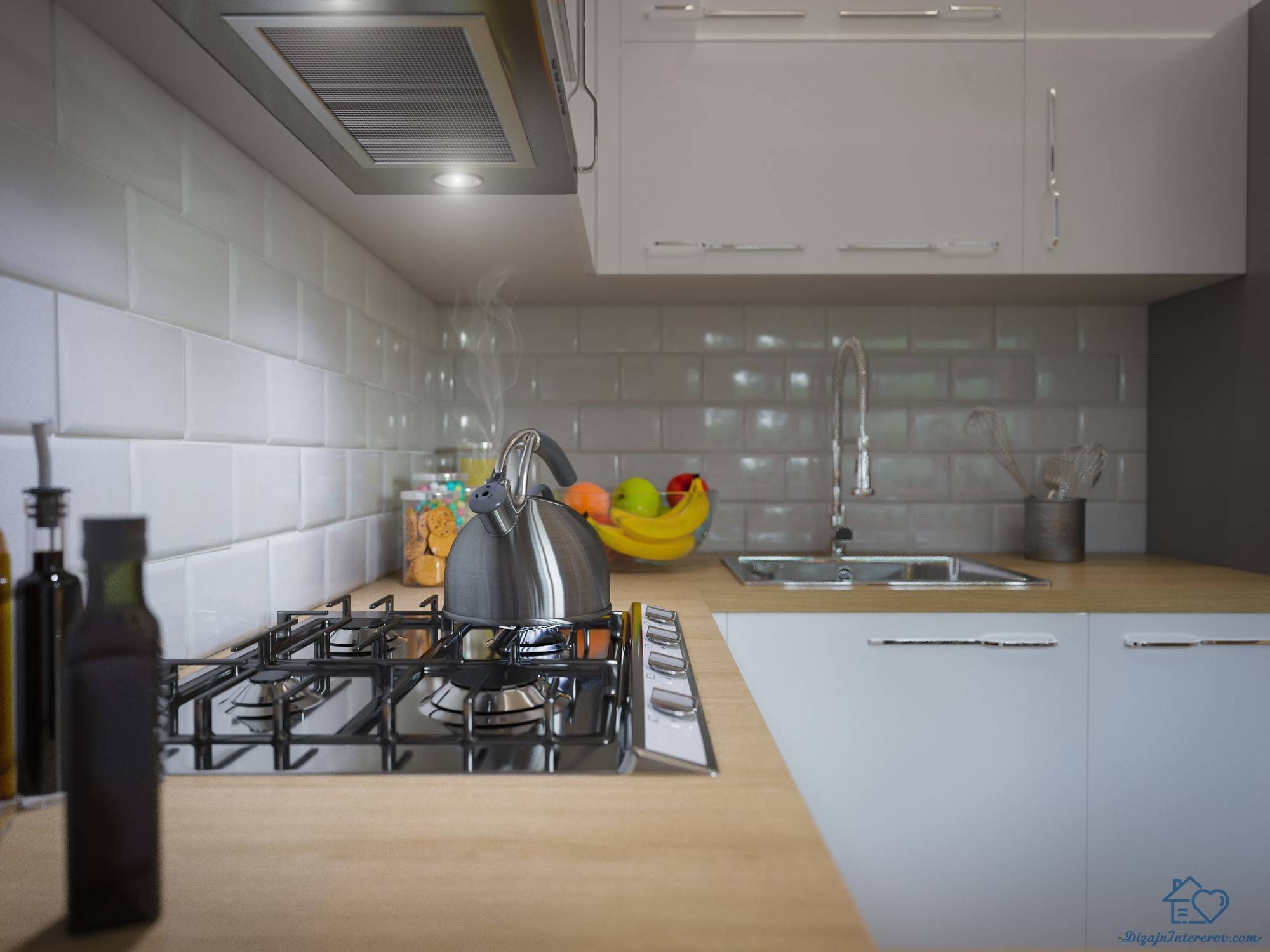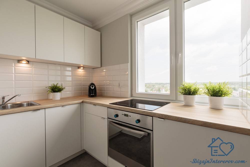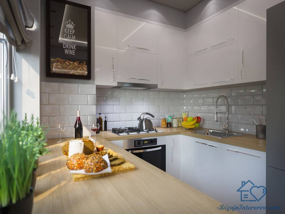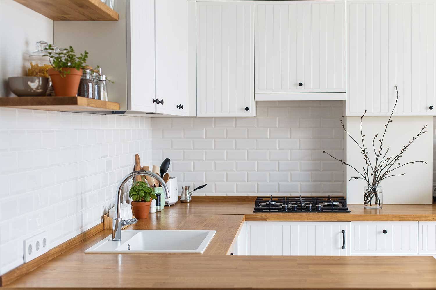Одно из самых популярных решений в интерьере кухни — белые фасады и деревянная столешница