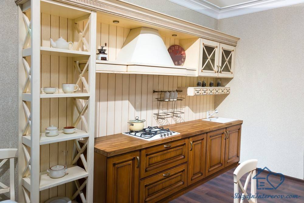 Совсем смелый вариант — отказаться от верхнего гарнитура и заменить его деревянными полками. Вот это решение действительно сделает кухню более просторной, даже самую крошечную. Но надо быть готовым к частой уборке этих полок от пыли.