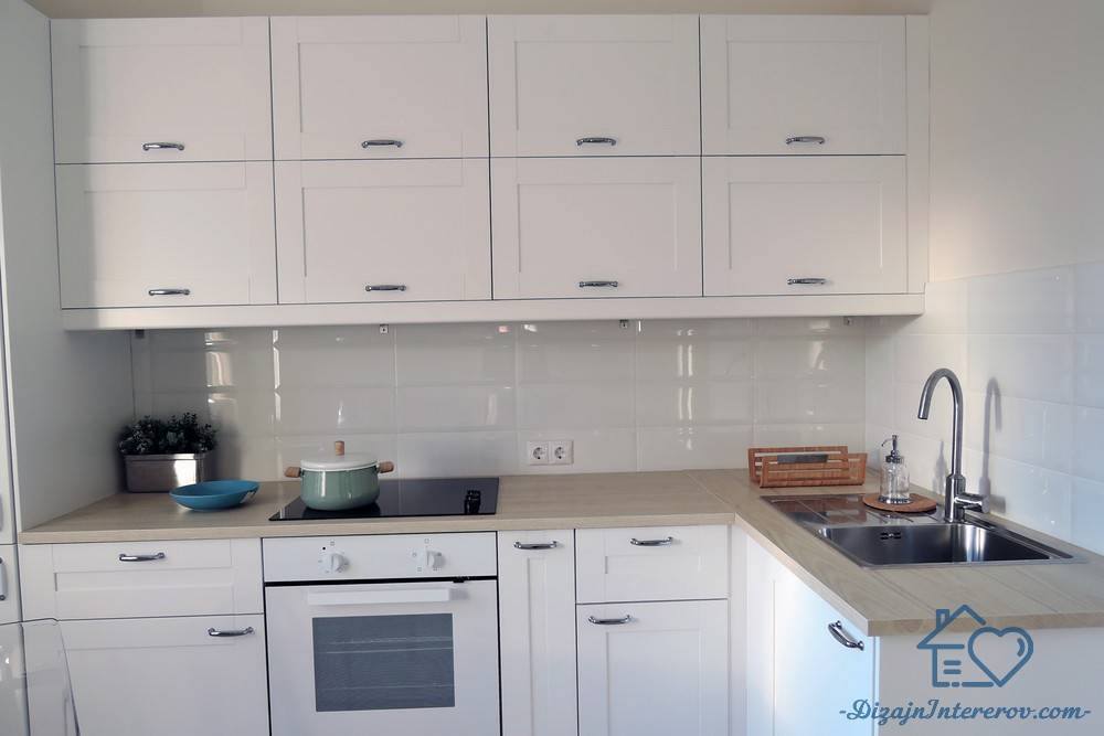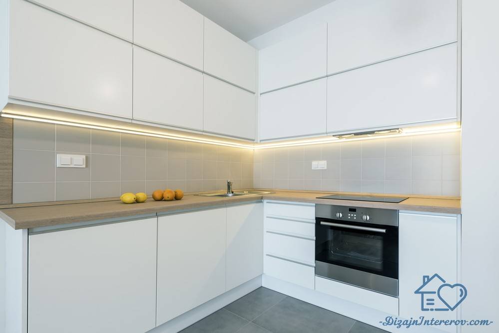 Очень важно соблюсти пропорции: 70% белого + 30% дерева. Если выбраны глянцевые фасады, то и рабочая зона должна блестеть — для этого используют лаковое покрытие
