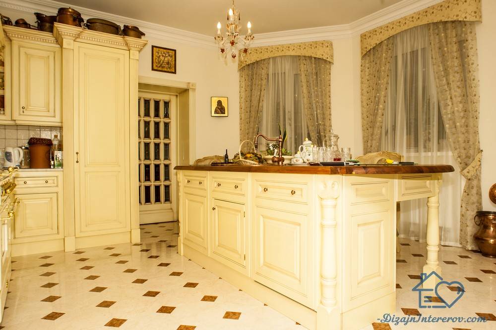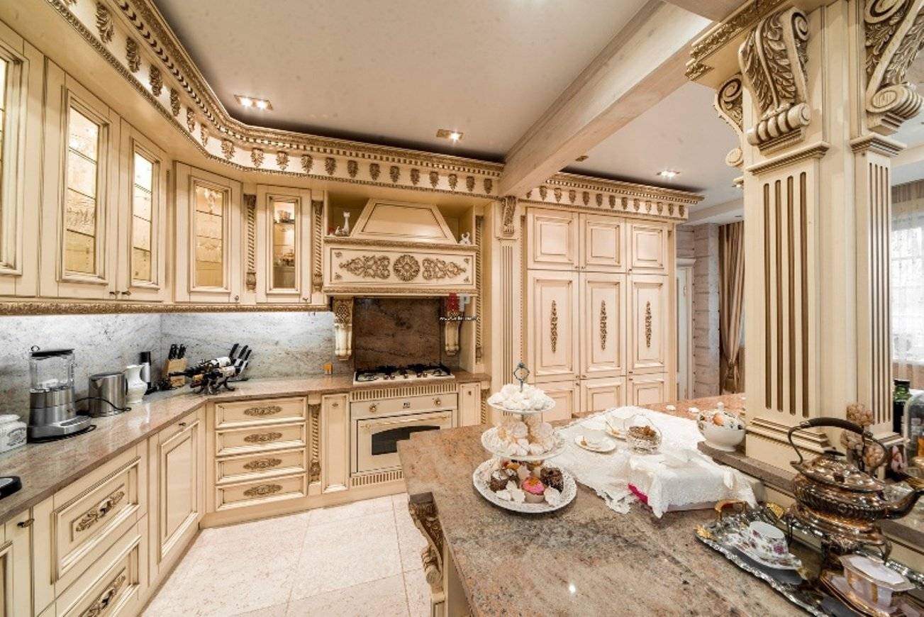 Стоит обратить внимание на рисунок патины фасадов, он должен быть изящным и соответствовать фактуре столешницы. Фигурная люстра, картины и текстиль выгодно дополнят интерьер и сделают его завершенным