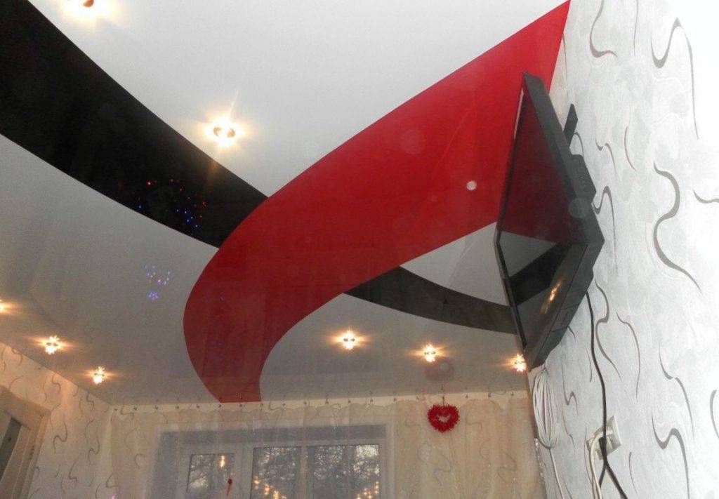 Такие комбинированные натяжные конструкции всегда заметны. Красный или бордовый с белым смотрятся интересно, смело и даже немного дерзко и являются очень необычным и оригинальным оформлением.