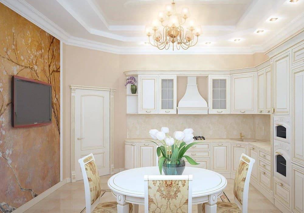 Кухня в стиле неоклассика подойдет не под любой размер квартиры и это нужно учитывать. Просто захотеть выполнить кухню в интерьере в данном стиле — мало. Помещение должно обладать большой площадью и высокими потолками, так как верхние шкафы будут находиться под потолком и в квартире с невысокими потолками такой дизайн не подойдет. Над верхними шкафами можно разместить антресоль, или сделать слегка опущенное потолочное покрытие, под которым будет проходить вытяжка. Все помнят, как раньше между потолком шкафами оставляли зазоры и были видны провода и окошко вентиляции.