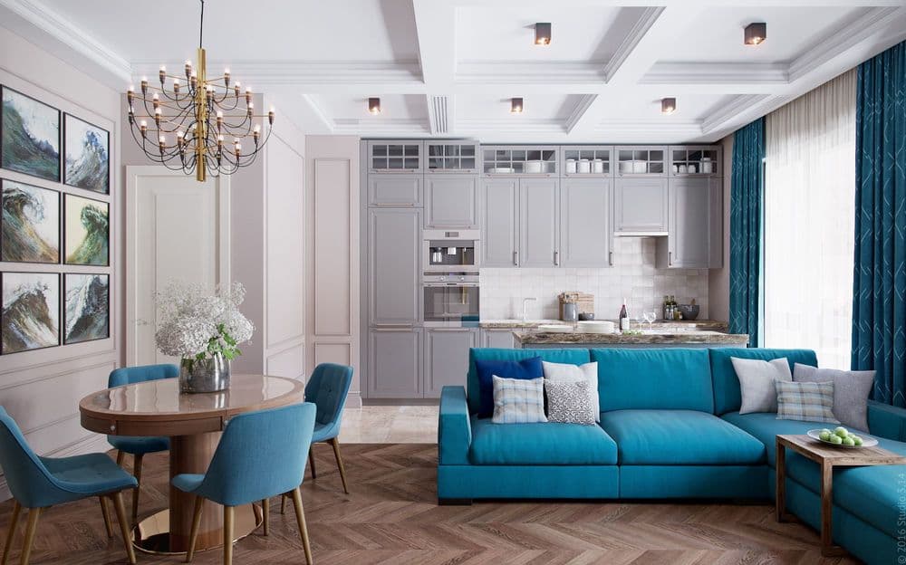 Выигрышнее всего в неоклассическом дизайне смотрится кухня, объединенная с гостиной. Декорировать комнату, разделенную на две функциональные зоны, не составит особого труда.