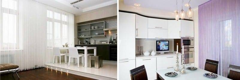 Кроме того, шторы нити способствуют зрительному увеличению пространства, приподнимая потолки. Поэтому такие шторы рекомендуется использовать на маленьких кухнях с низкими потолками.