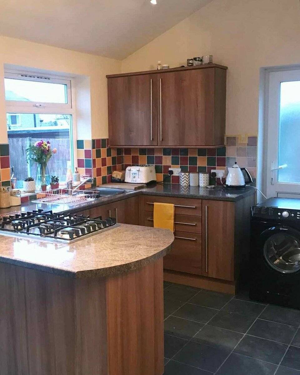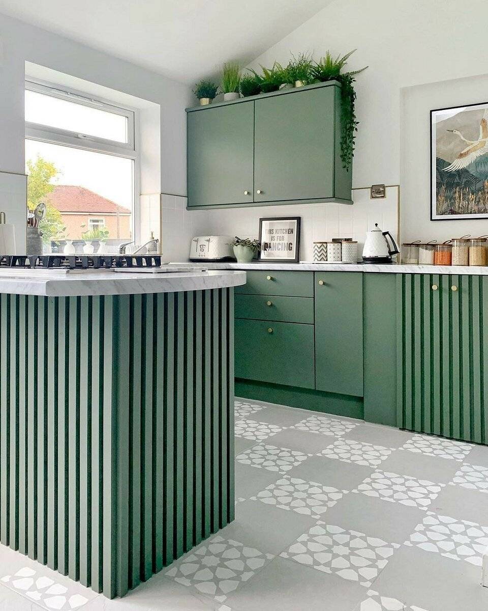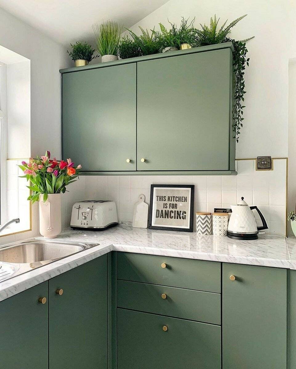 При взгляде на новый интерьер этой кухни возникают ассоциации со свежестью и весной. Все дело в выбранных оттенках: нежный зеленый на фасадах и белый на стенах, кухонном фартуке. Обновления, на самом деле, больше косметические. Фасады покрасили, полуостров обновили с помощью краски и реек, столешницу закрыли пленкой. Плитку на кухонном фартуке покрасили, как и напольное покрытие. Единственные глобальные работы коснулись дверного проема в углу, который заложили. И достройки кухонного модуля там же, фасады которого тоже декорировали рейками. Дополнил атмосферу декор: сухоцветы, зеленые растения, зеркало, золотистые детали.
