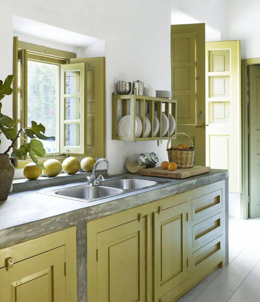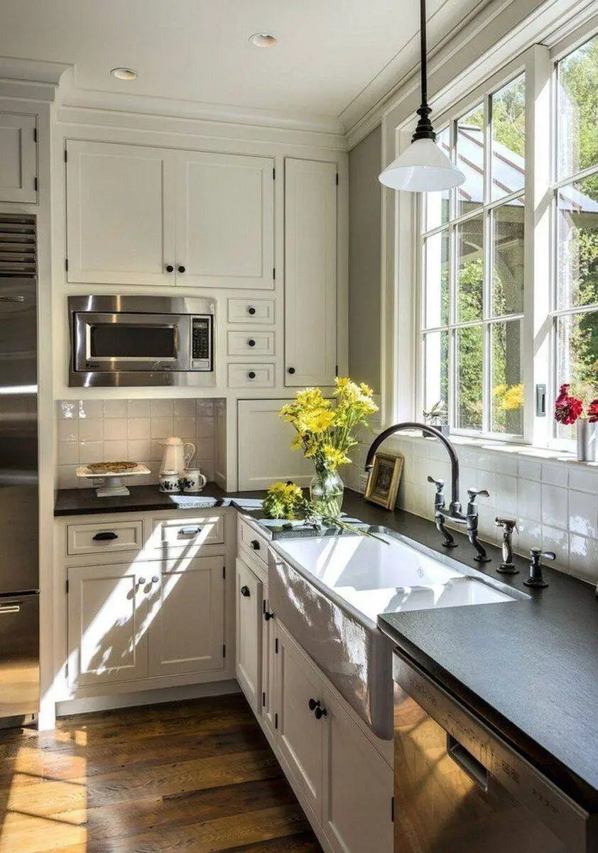 Зона окон тоже может использоваться функционально. Этот участок ограничивается только одним условием – в это место не установить навесные шкафы. При этом под окном может разместиться мойка или столешница. А по бокам Вы можете повесить шкафы или полочки. Обеденная зона у окна будет обладать невероятным уютом.