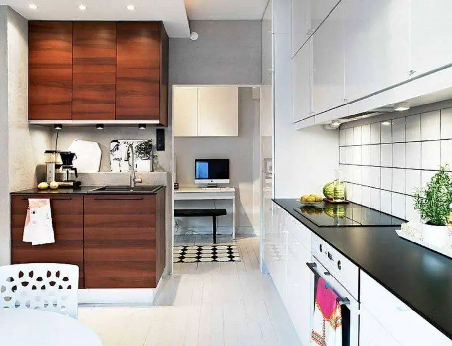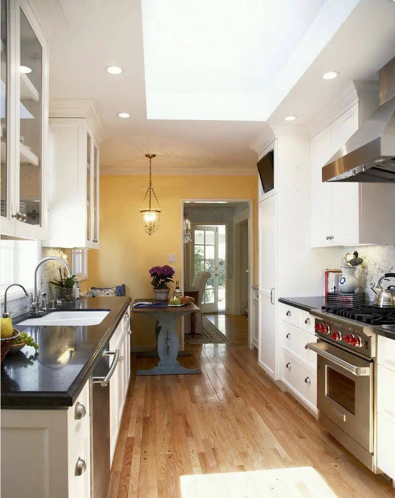 В кухнях в форме узкого коридора под прием пищи лучше выделить полную ширину в дальнем конце комнаты.
