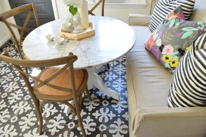 Разделить кухню на две области с помощью напольного покрытия получится, если помещение обладает достаточным размером. Поверхность пола разделенное любым покрытием в миниатюрной комнате проявит сильнее ее недостатки, зрительно уменьшит.