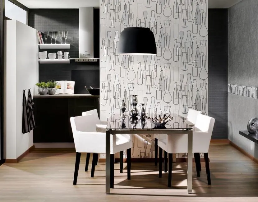 Обои – самый распространенный вариант отделки столовой зоны. Можно сочетать приглушенные однотонные обои с более яркой декорированной вставкой в зоне стола. Нередко для разграничения обои сочетают с окрашенными в тон стенами.