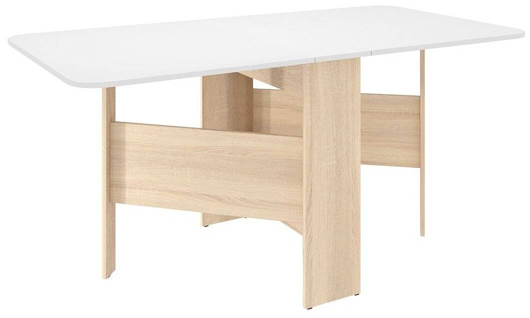 MEBELSON Мечта 2 – стол-книжка, имеющий весьма компактные размеры в сложенном виде, благодаря чему будет оптимальным вариантом для установки на кухнях небольшой площади. Оформлен в современном минималистическом стиле, сделан из прочных надёжных материалов, отделан под натуральную древесину. В собранном состоянии размеры прямоугольной столешницы составляют 23х80 см, а в разложенном – 160х80 см, благодаря чему за столом смогут расположиться до 8 человек. Отделка выполнена под дуб, поэтому данный стол будет отлично гармонировать с другими предметами мебели. Толщина столешницы оптимальная 16 мм, уровень прочности хороший, качество декоративного покрытия великолепно. Поверхность не маркая и не требующая особого ухода в процессе эксплуатации.