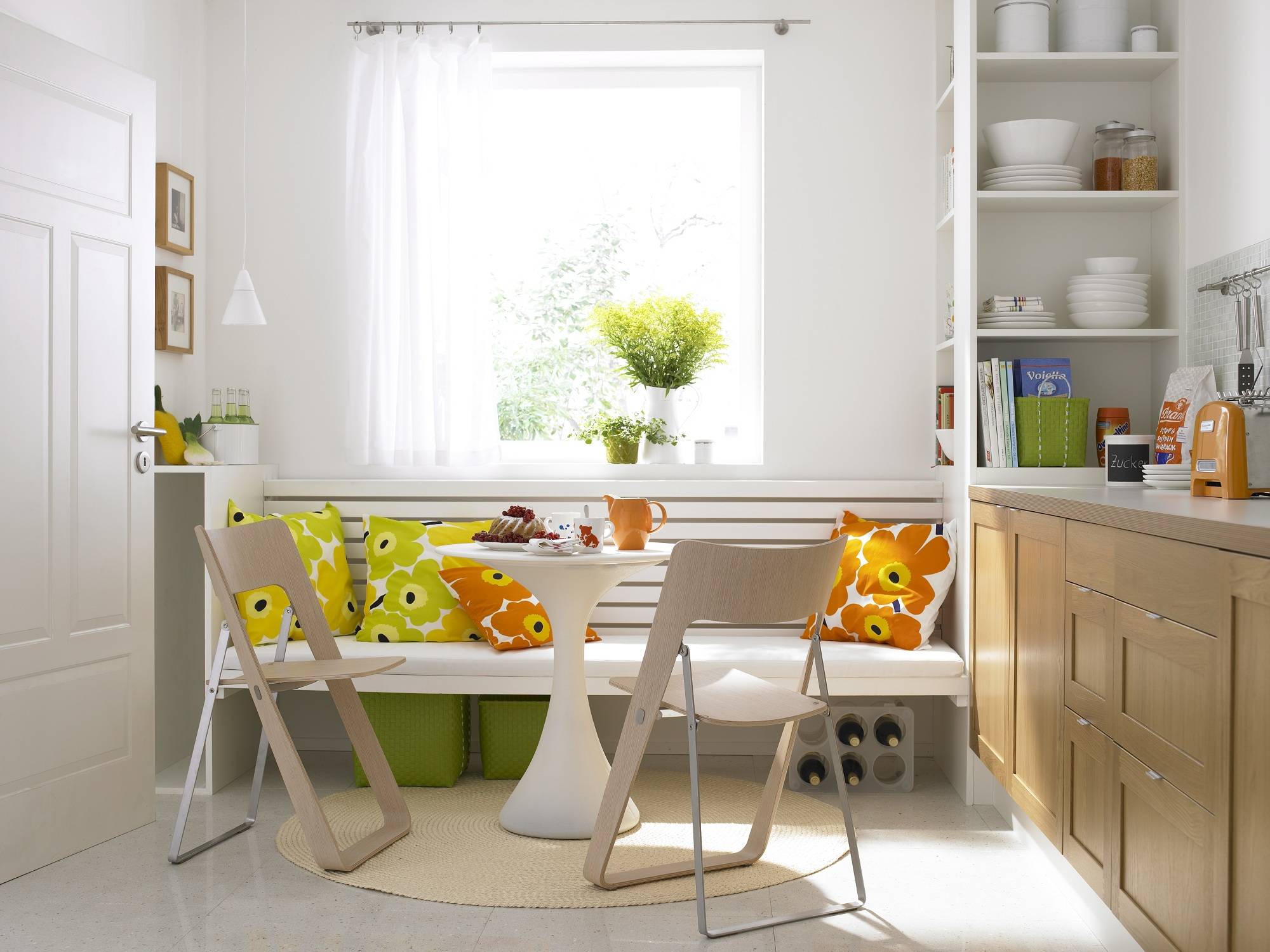 - Кухонный стол круглой формы, установленный в углу, теряет свою вместительность, так как таким образом, за него могут сесть не более двух человек;