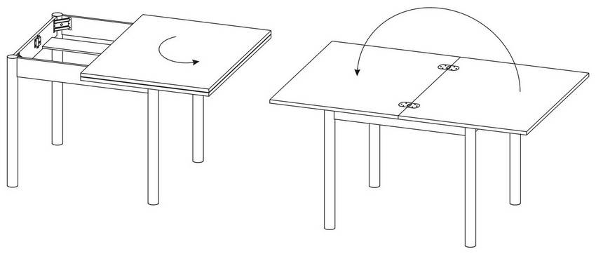Их отличие заключается в возможности увеличения количества посадочных мест за счет дополнительной столешницы. Возможны несколько вариантов конструкции и механизма трансформации.