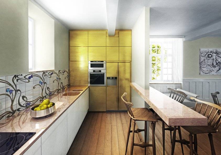 Кухня-столовая в золотисто-охристых тонах в сочетании с белым цветом.