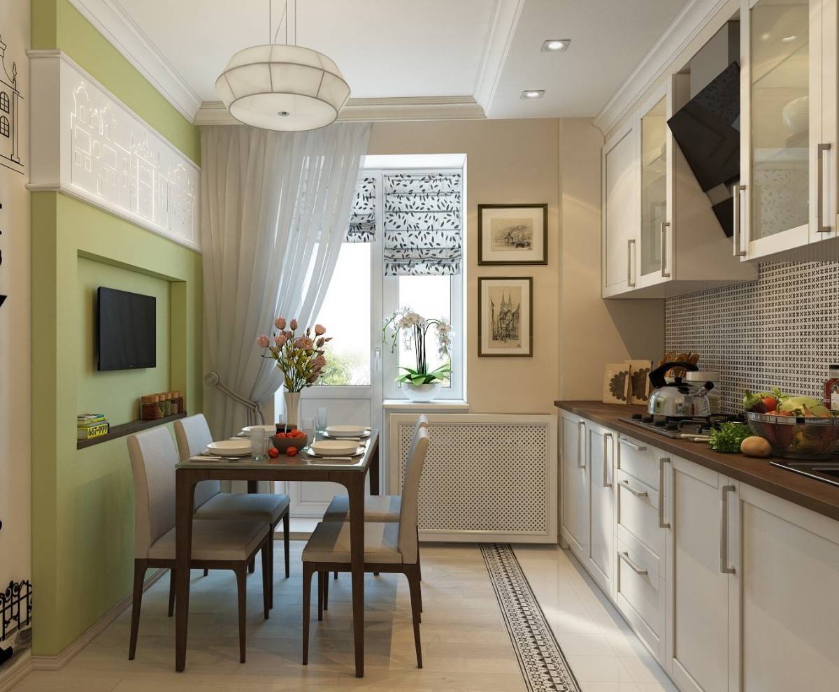 Подходящее пространство для такого выбора — просторная кухня с потолками от трех метров. Маленькая кухня может претендовать на такое оформление, только если гарнитур светло-бежевый, а стены, фартук, шторы и декор белые или отличаются от гарнитура на два — три тона.
