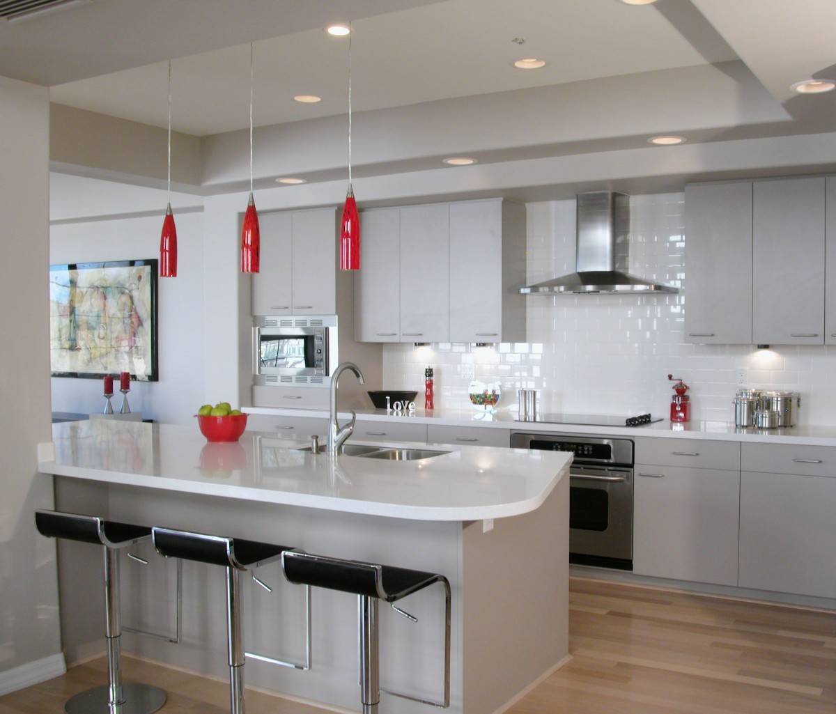 Красный в качестве ярких акцентов в дизайне белой кухни