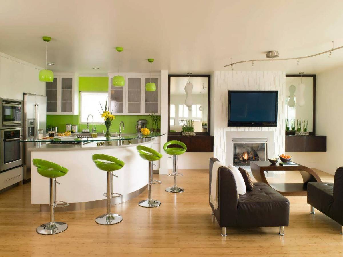 Этот цвет универсален, хорошо сочетается с любой гаммой. Поэтому для расстановки акцентов можно использовать любой яркий тон. Вот, к примеру, взгляните, как в светло-бежевую кухню гармонично вписалась акцентная стена салатового цвета.