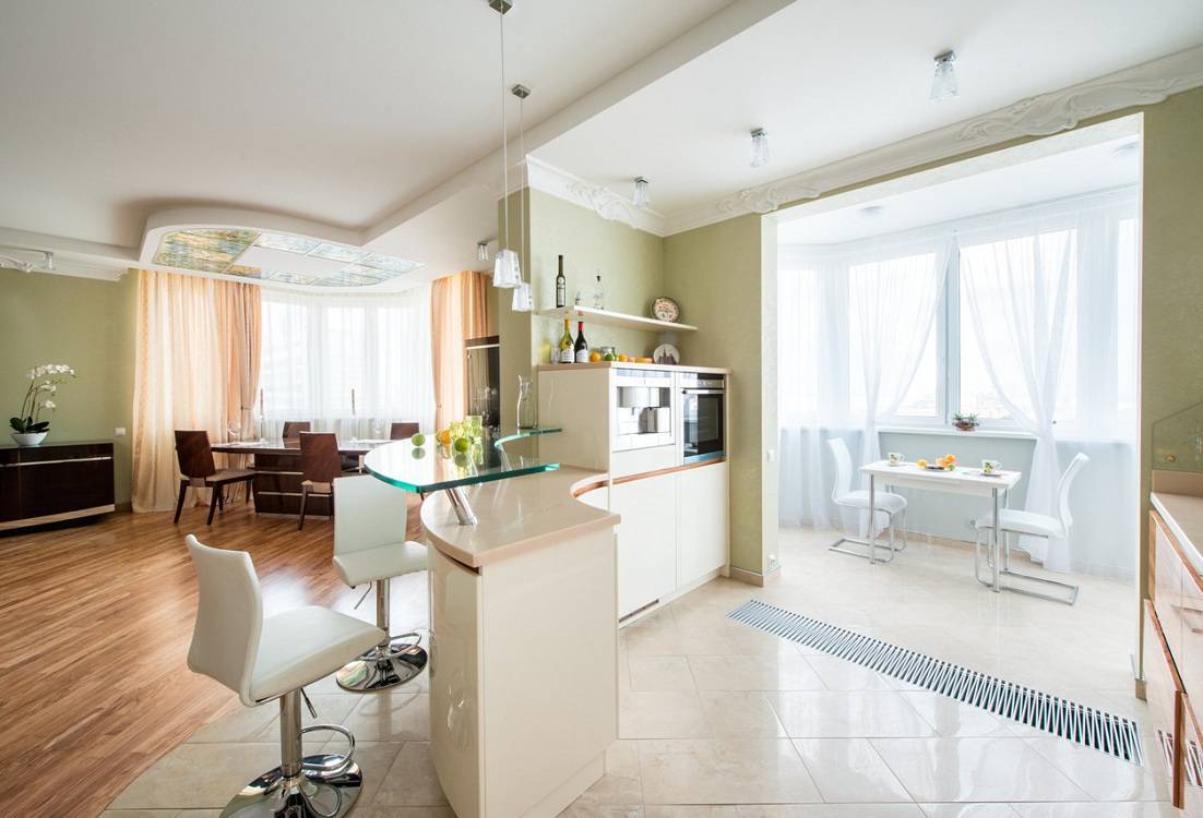 Соединив балконы с кухней, следует подумать о визуальном зонировании помещения. Очень эффектно смотрятся декоративные арки разной конфигурации и формы. Проем с волнистыми откосами хорошо подойдет к интерьеру в стиле модерн, квадратная арка сочетается с современным дизайном, а полукруглая – с традиционным классическим. У кухни, совмещенной с лоджией, пол может быть выше или ниже, чем на балконе. Его можно обыграть, сделав в виде подиума с подсветкой. Такой интерьер совмещенных помещений выглядит стильно и изысканно, выполняет функцию зонирования.