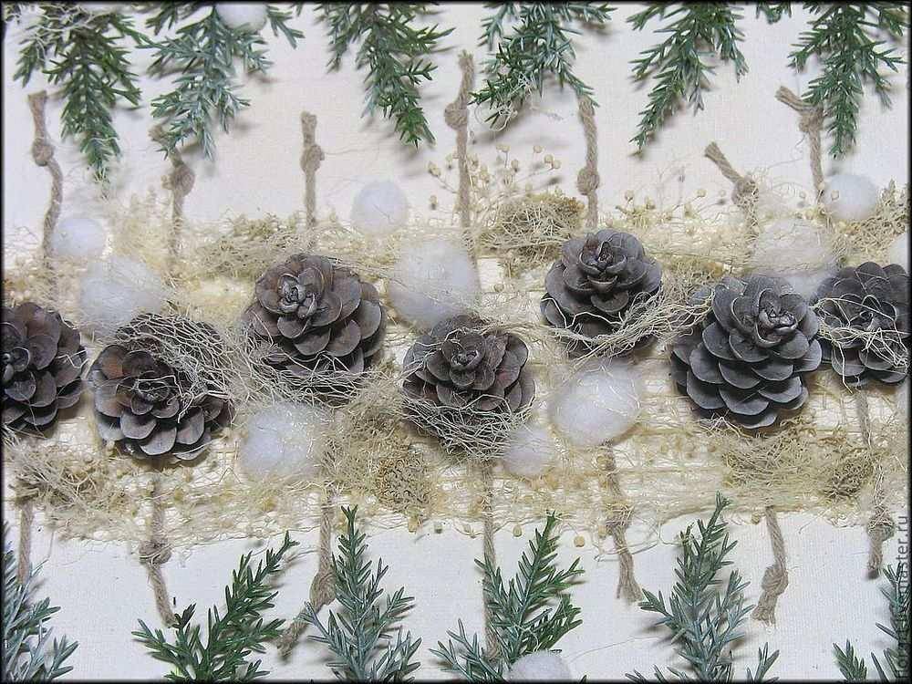 Панно из шишек – более сложная работа, так как с шишками не очень-то просто работать. К слову, из простых сосновых шишек можно сделать белоснежные, и все это с помощью простой белизны. Ну а уже такие белые шишки – где только не используешь.