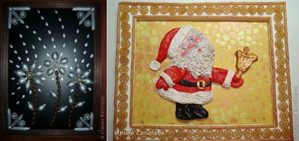 Кроме пластилина, один из самых популярных материалов для панно — макароны: есть огромное разнообразие макаронных изделий самых разных форм и размеров