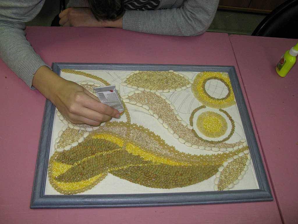 Если же желание творить уходит дальше, чем выполнение задания для детского сада, то можно попробовать сотворить удивительный пейзаж на стекле. Для этого необходим готовый напечатанный зимний пейзаж, который устанавливается в рамку со стеклом. Далее деревья, кусты и елки заполняются крупой, например, рисом или гречкой, в зависимости от вида деревьев. Стволы выполняются из тонких веточек и крепятся к стеклу на суперклей, сугробы становятся объемными с помощью бумаги, разорванной на мелкие кусочки. Завершает работу грунтовка и роспись акриловыми красками. Фон из-под стекла можно удалить и собственноручно на листе ватмана дорисовать детали.