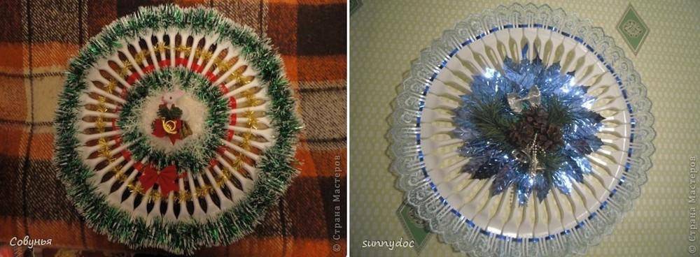 - Круг этот декорируется, обматывается мишурой, к нему горячим клеем фиксируются концы одноразовых вилок;
