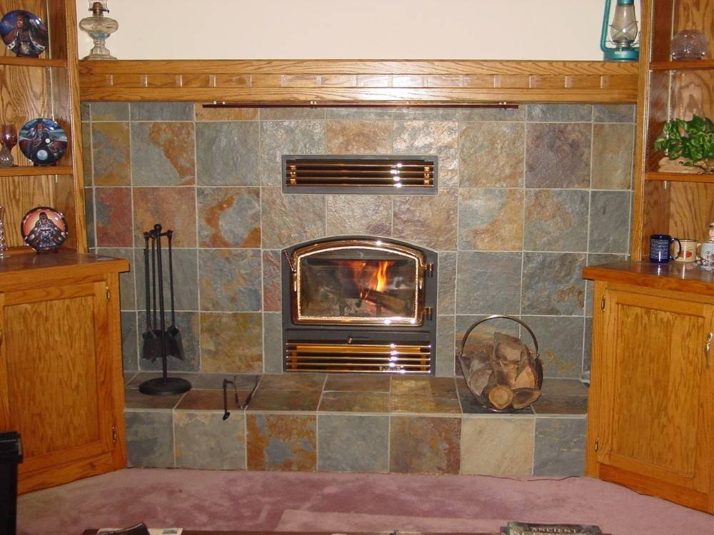 Здесь искусственным камнем выполнена отделка стены за печкой и пола под ней.