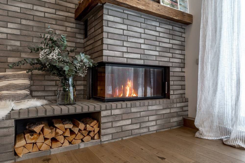 На изображении печь, отделанная клинкерной плиткой серого цвета. Вместе с корпусом печи отделан участок примыкающей стены. Получается аккуратная и стильная поверхность, способная вписаться в любой современный интерьер.