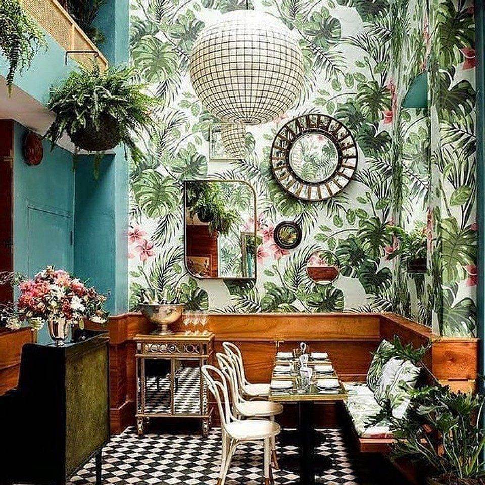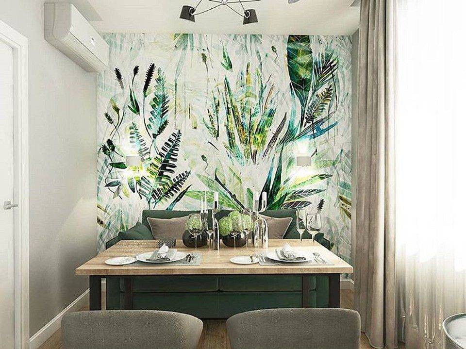 Лучшее решение — одна стена с сочным природным принтом и полный нейтралитет во всем: от диванов до подсвечников.