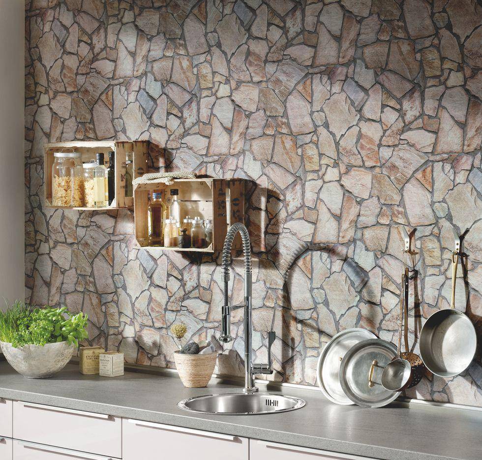 Если тотальный монохром вам кажется скучным, посмотрите в сторону фактурных полотен, внешне повторяющих кирпичную кладку, бетон или мрамор, — и вот у вас уже вырисовывается стиль лофт. Также грубая кладка выигрышно смотрится в нежном провансе или шебби-шике.