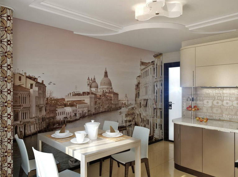 Фотообои в обеденной зоне будут тоже допустимы. Сюжет их должен соответствовать стилю:
