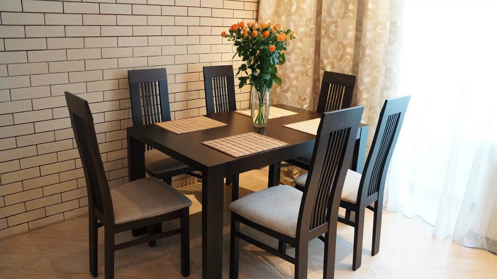 Обои не клеят в рабочей зоне у стола, а также избегают приклеивание покрытия, если обеденный стол приставлен к стене. Либо вести себя предельно аккуратно во втором случае.