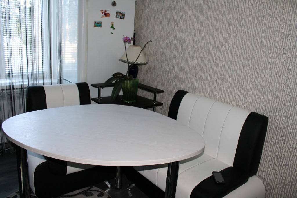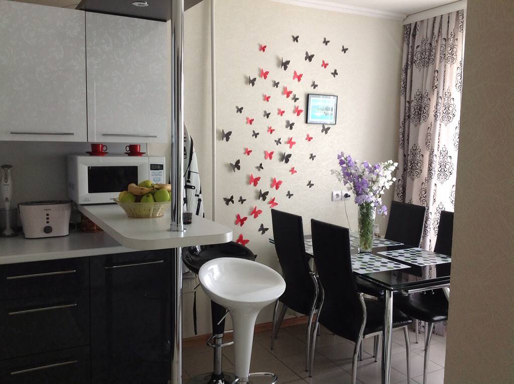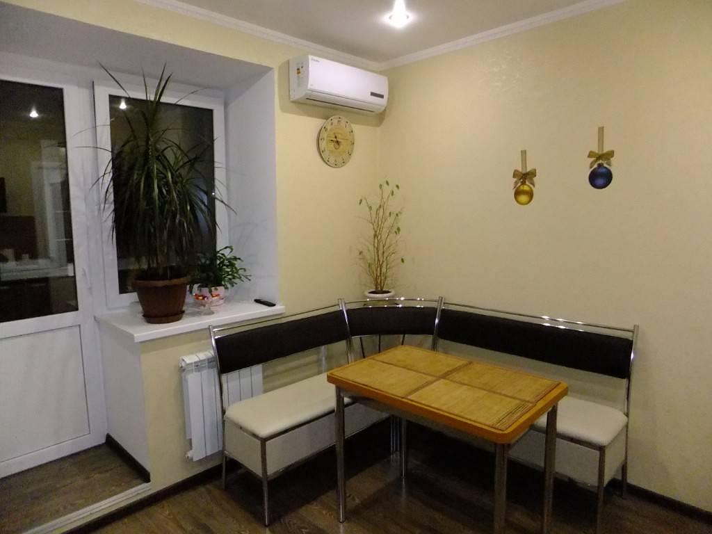 Если такой возможности нет, нужно просто демонтировать окно и дверь на балкон, оборудовав на их месте своеобразную барную стойку, которая будет служить обеденным столом.