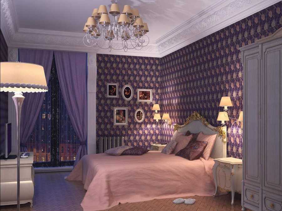 - фиолетовые обои комбинируются с голубым, лавандовым, серым, желтым, розовым и многими другими оттенками;