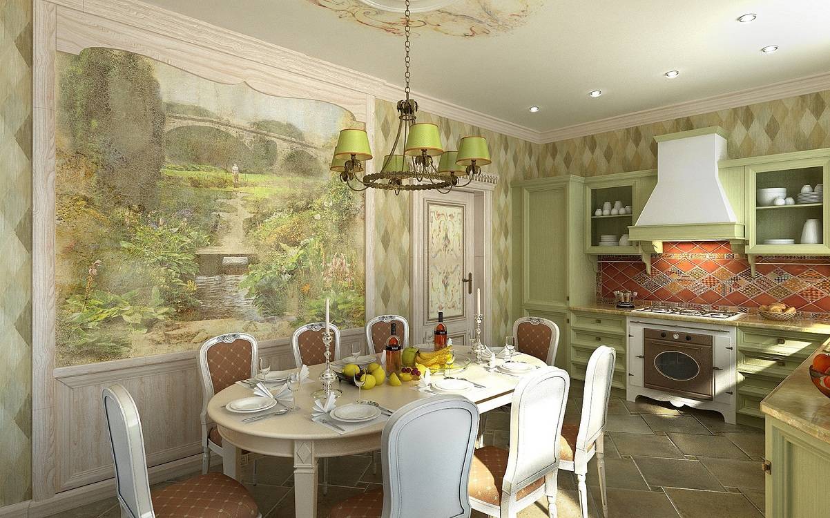 Для кухни в классическом стиле подойдут фрески натюрморты, пейзажи, обои в стиле античной росписи или мозаики, стиль эпохи Возрождения и др.;