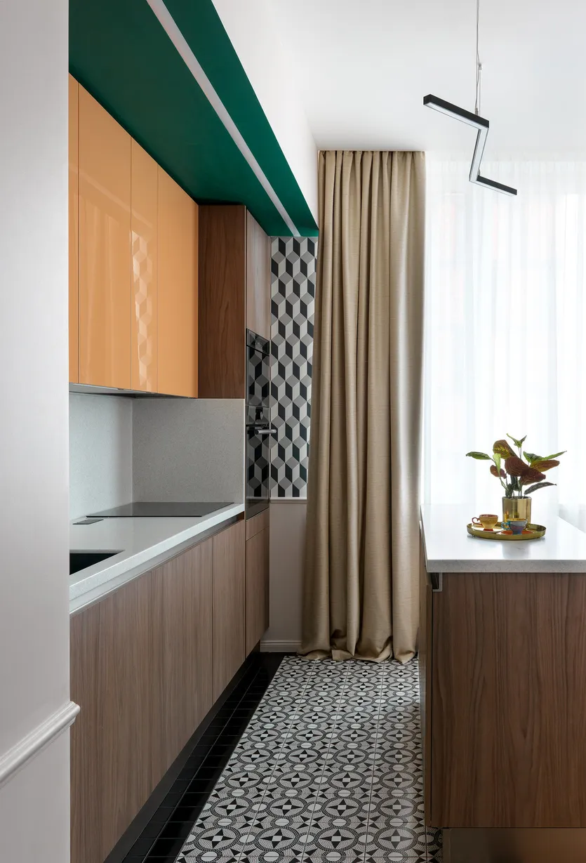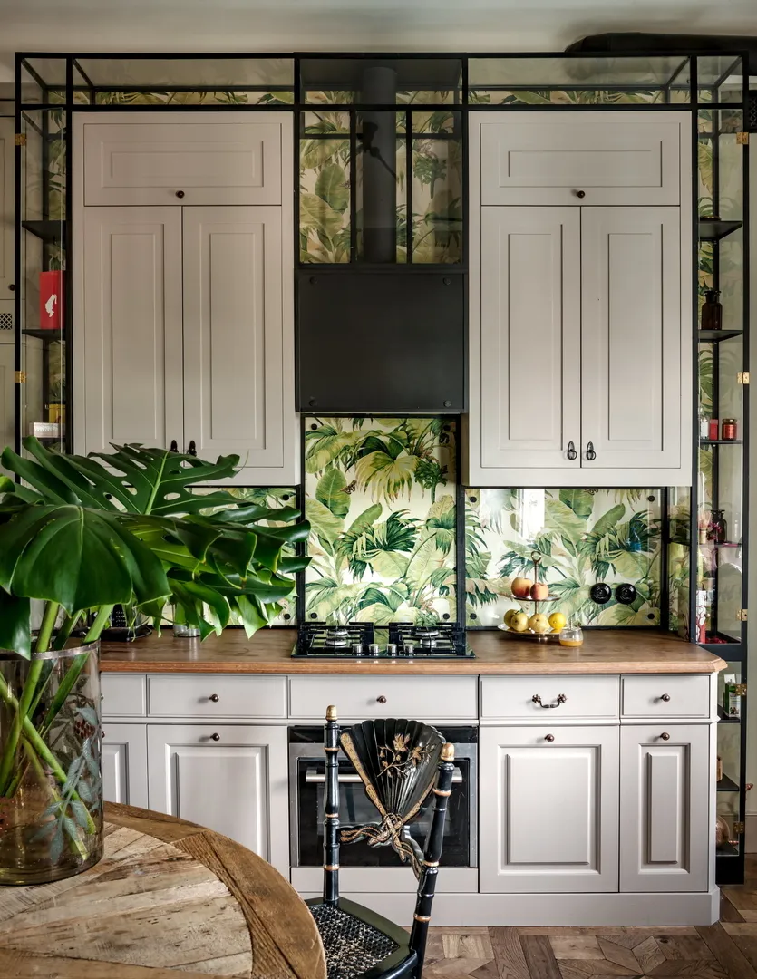 Кухня в проекте Марты Храпки. На стене — обои с тропическим принтом, Boussac