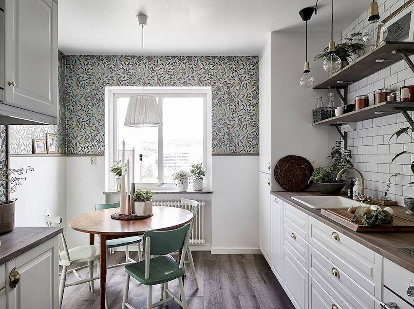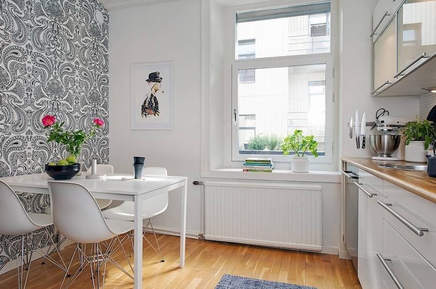 Обои для маленькой кухни, зрительно увеличивающие пространство, как правило, выполнены в одном цвете. Однако те, кто предпочитает шпалеры с рисунком, могут использовать и другие варианты. Не ошибиться с выбором помогут простые правила.