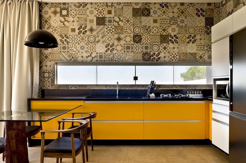 Чтобы желтый гарнитур дарил приятные ощущения, его следует уравновесить белыми или молочными обоями. При большой интенсивности данный оттенок будет раздражать и вызывать апатию. Желтые предметы мебели в сочетании с белыми стенами выглядят нарядными, а с молочными – теплыми и мягкими. Природным сочетанием является созвучие желтого и зеленого, что подарит удовольствие от пребывания на кухне.