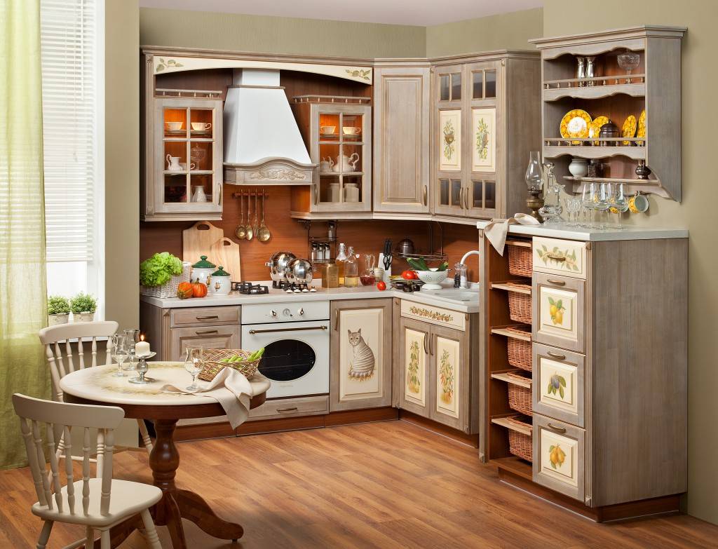 Например, украсить дверцы трафаретным узором или контрастными полосами или использовать кракелюрные лаки для придания поверхности эффекта старины. Более сложный декор на кухне с различными рисунками, фото которого часто можно увидеть в интерьерах в стиле прованс и кантри. На самом деле такое украшение довольно просто нанести, используя салфетки для декупажа. Сегодня их разнообразие позволяет воплотить любую идею.