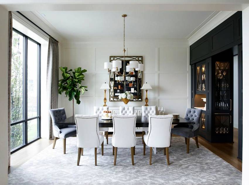 Классический стиль. Подойдёт мебель чётких геометрических форм и нейтральных оттенков. Любители эклектики могут попробовать сочетание разных направлений. Например, классический стол дополнят стулья в стиле ар-деко контрастной расцветки. Иногда достаточно выразительной детали: один из стульев с мягкой спинкой можно заменить креслом с обивкой капитоне.