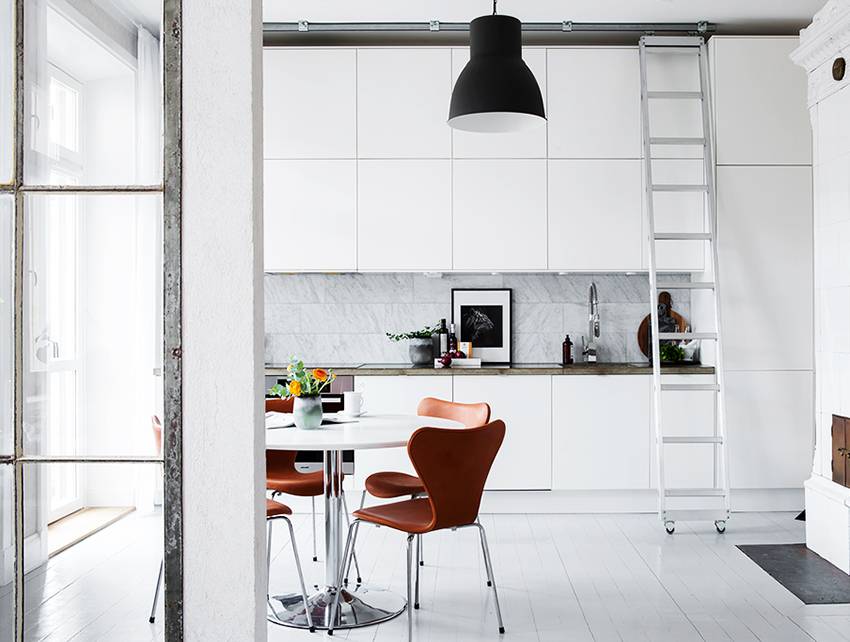 - Цвет. Если кухня выполнена в одной цветовой гамме, на обеденной зоне можно сделать особый акцент, поставив стол иного цвета, чем основной гарнитур. Черный в классическом варианте сочетается с белым, а белый в свою очередь с красным.