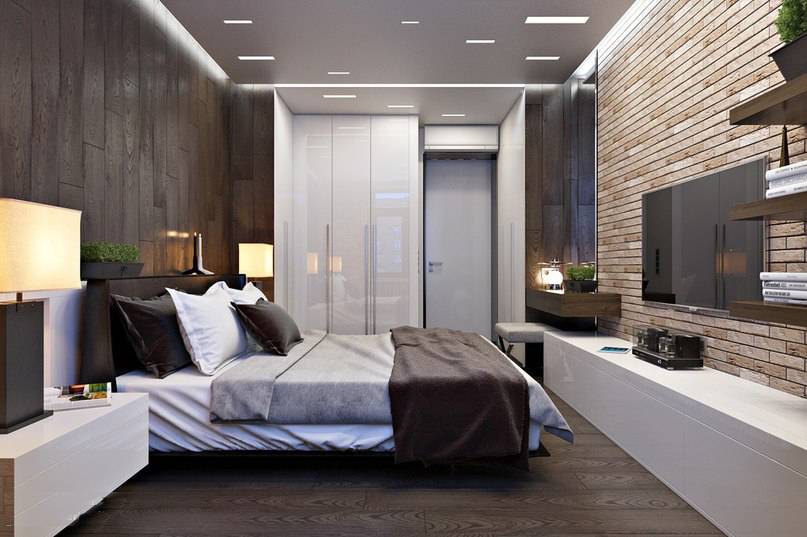 Зонирование пространства удобно делать с помощью света или многоуровневых потолков. При современных планировках иногда к спальным комнатам примыкают ванные комнаты, что очень удобно и практично. В этом случае санузел оформляется относительно личного вкуса владельца, поскольку тут нет никаких строгих правил, поэтому он может быть оформлен как в общий дизайн со спальней, так и в любой другой стилистике.