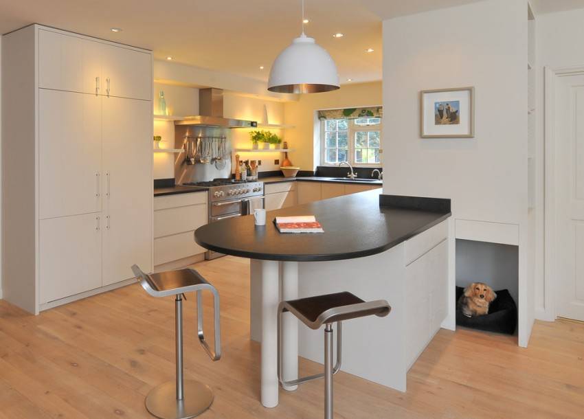 После установки модели, совмещенной с гарнитуром, кухня приобретает форму буквы Г или П. Один узкий край столешницы стойки прикреплен к гарнитуру, второй стоит на опоре.