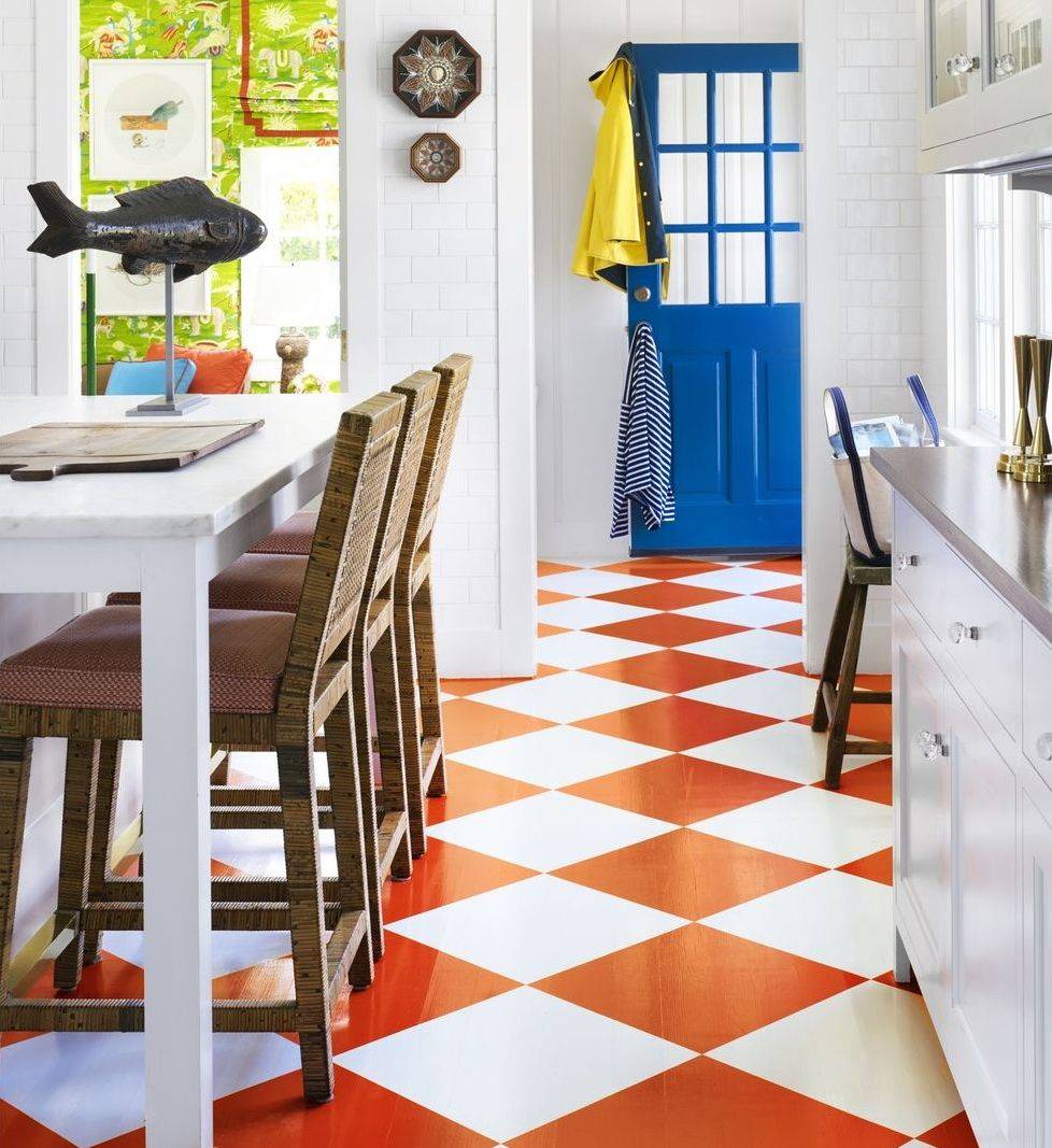 Оранжевый пол в кухне, шахматная раскладка плитки