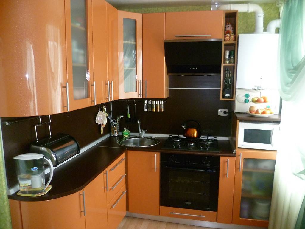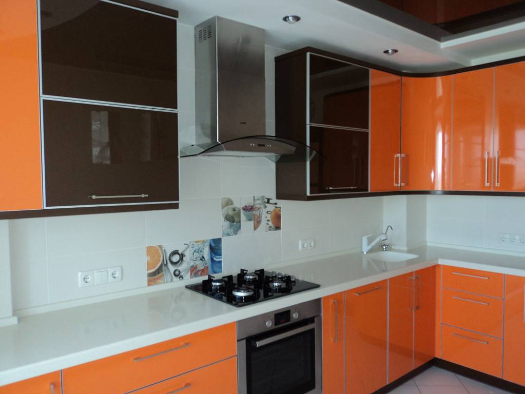 Если кухня не слишком большая, с этим цветом нужна осторожность. Лучше, чтобы только определенные фасады гарнитура были оранжевые, но вот оформлять в нем всю конструкцию не рекомендуется
