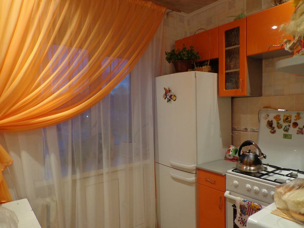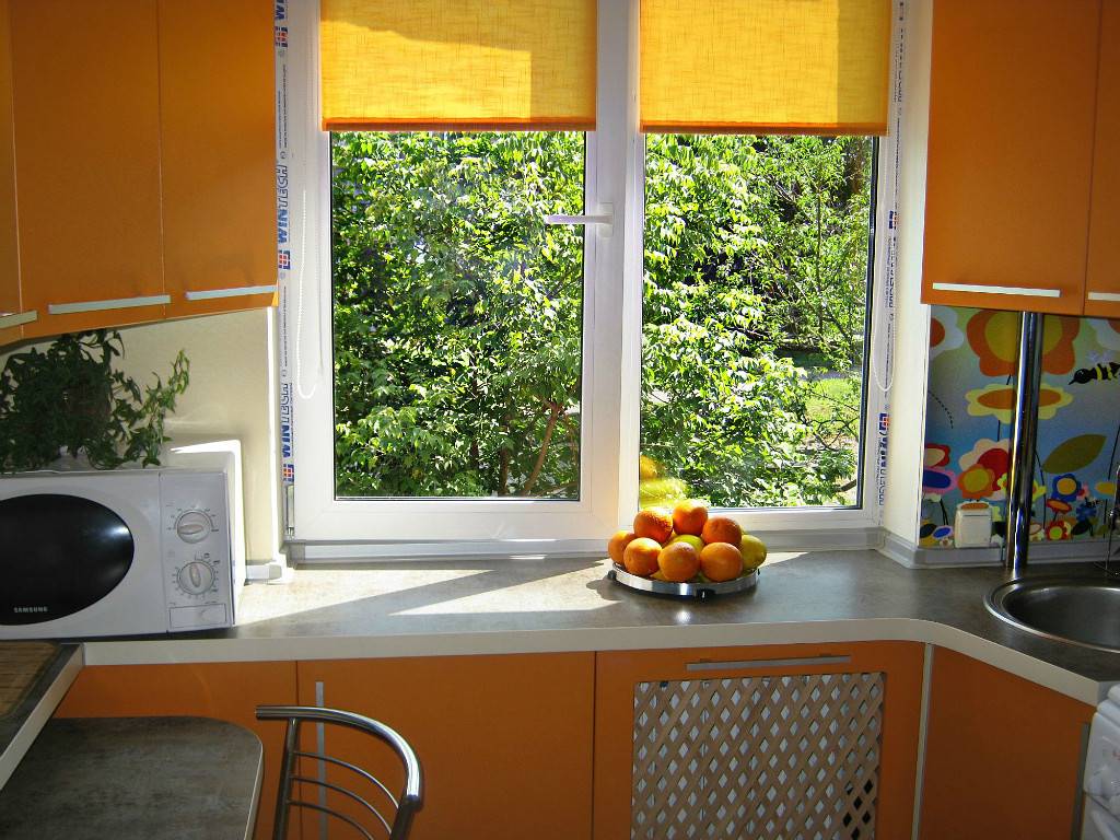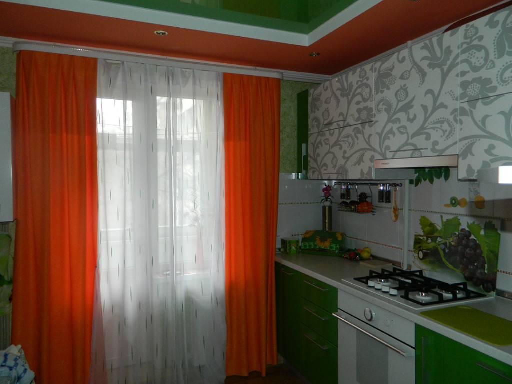 - Шторы под оранжевую кухню подбираются с учётом выбранного стиля. Если поработать над оттенком, то они создадут неповторимый интерьер. В основном используются лёгкие занавески. Они создадут апельсиновое настроение, а окружающие их предметы в холодных тонах снизят интенсивность цвета. Главное, не перегружать обстановку активными элементами. Достаточно двух-трёх объектов аналогичной расцветки. Например, обивка сидений, декорирование фасадов, люстра с абажуром в тон.
