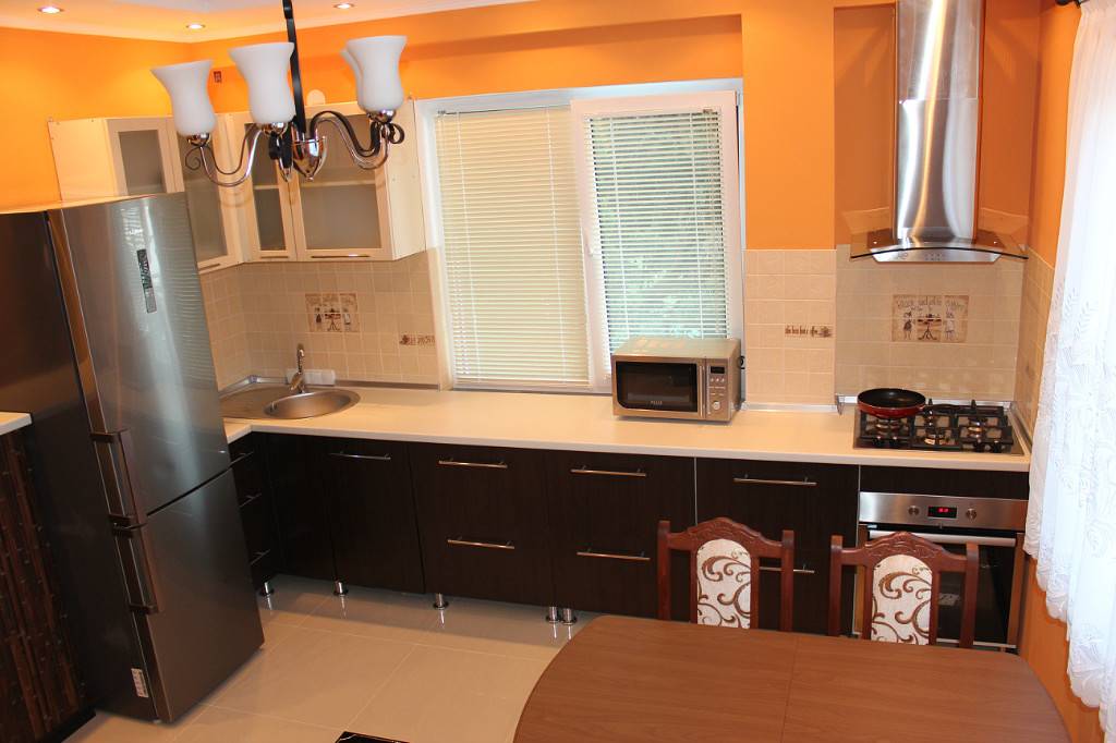 Например, светлые (голубые, белые, бежевые) верхние шкафы добавят пространству воздушности. Оранжевый верх и тёмный низ (венге, чёрный, графитовый) подойдут для Хай-тека.