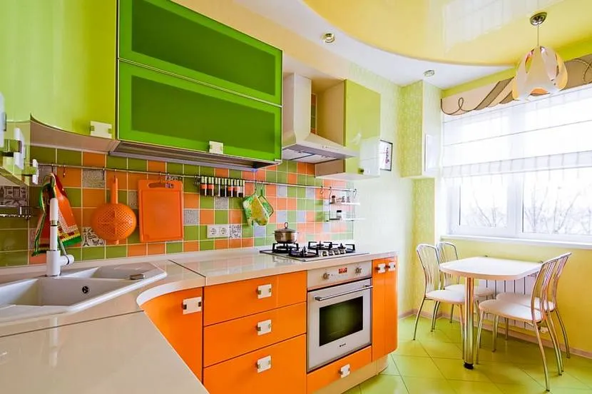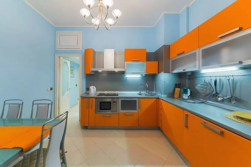 Например, на фоне оранжевых стен лучше всего будут смотреться шкафчики другого цвета.