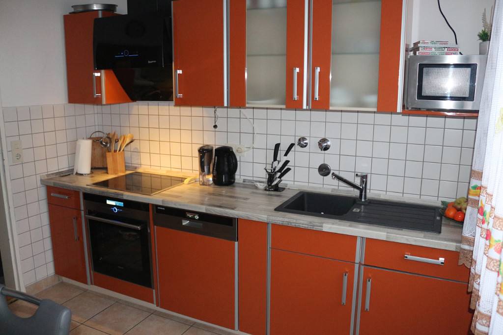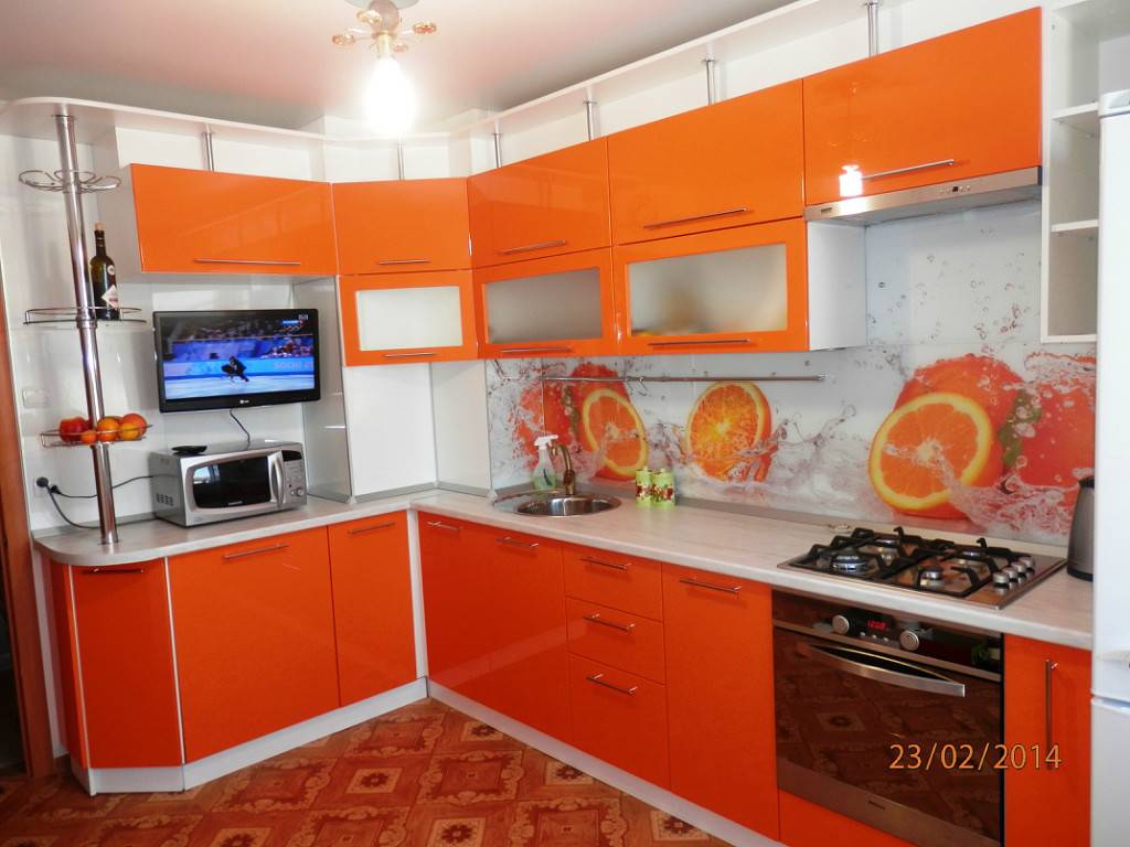 Хотите подчеркнуть яркость оранжевой мебели, используйте белый фартук.