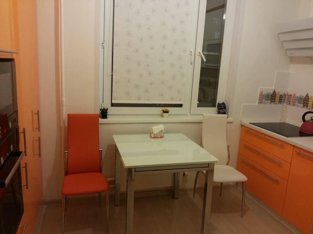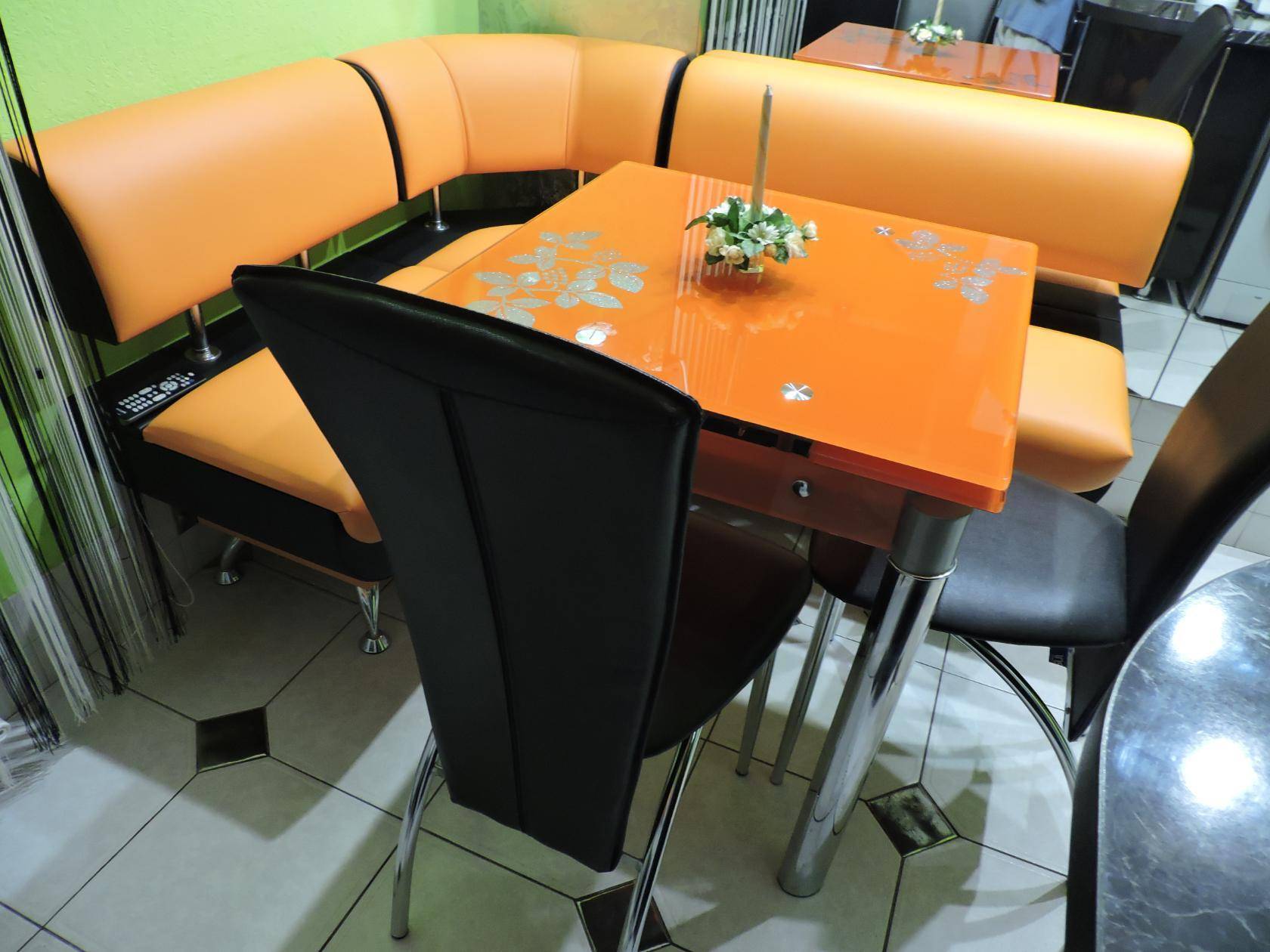 Стол и стулья. Выгодное решение – выбор обеденного стола из стульев из специального прозрачного оранжевого пластика. Если кухня оформлена в стиле минимализм либо хай-тек, то основания этих предметов могут быть металлическими и иметь хромированную поверхность, а верхняя часть – быть сделана из прочного пластика солнечного цвета.