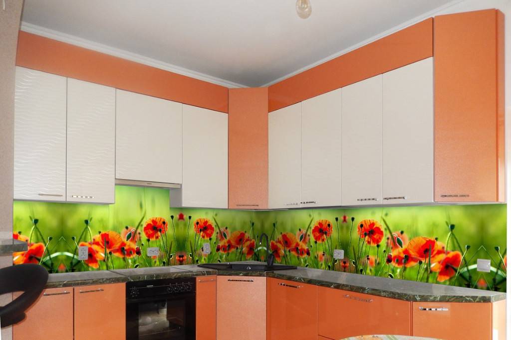 Для рисунка подойдут цвета, которые гармонируют с оранжевым – серый белый, все оттенки оранжевого. Самый экономичный вариант, это керамическая плитка с вкраплениями другого цвета. Наиболее дорогими выйдут стеклопанели с нанесением фотопечати.